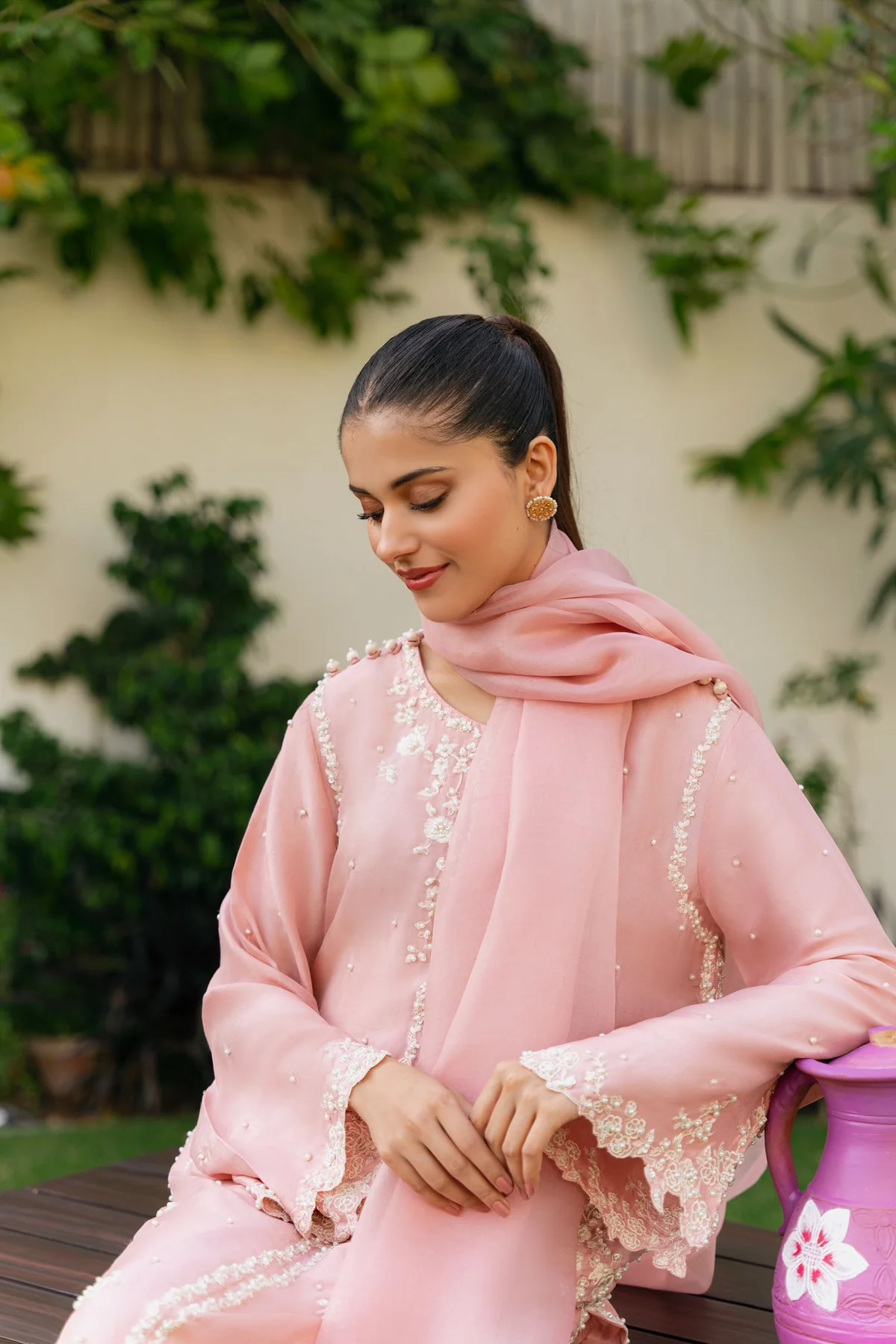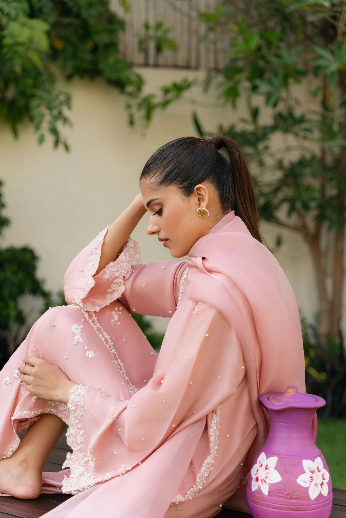 Meticulously crafted from a remarkably glamourous shade teapink ( pure raw silk 58 Gms ) “ Ameema “ with its intricate offwhite crafted details strikes the perfect balance between elegant and eye-catching, making this beautiful design a must have. The length of the long kameez is 47 inches.