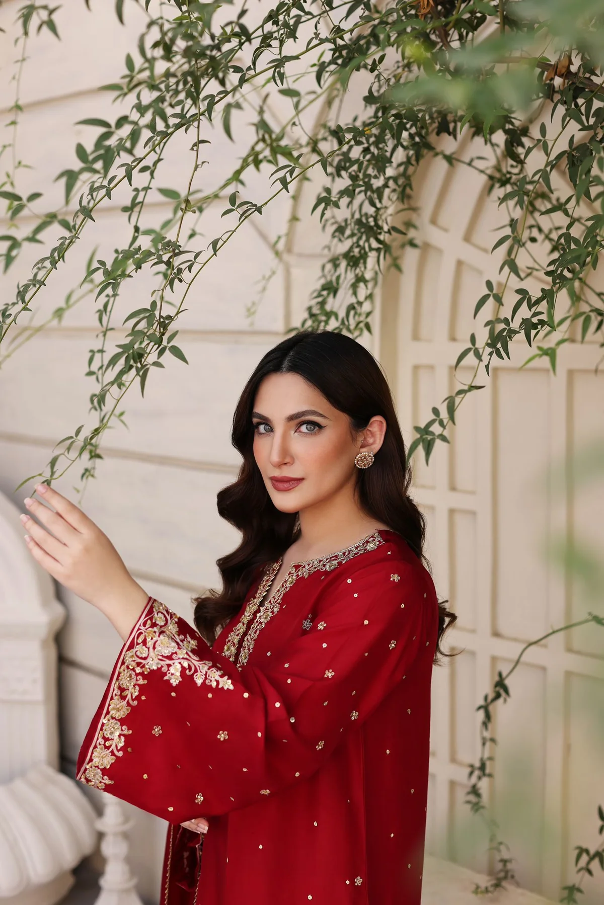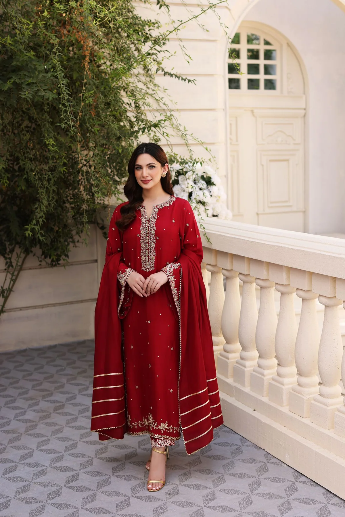 Heavily embellished on a pure maroon raw silk 58 Gms with intricate gold zardosi craftsmanship in a long kameez silhoutte, the handwork on this beautiful design takes upto 150+ hours to complete by our chosen expert artisans, styled with a matching silk dupatta with gotah alongside matching trousers featuring zari borders. Turn heads in this beautiful design.