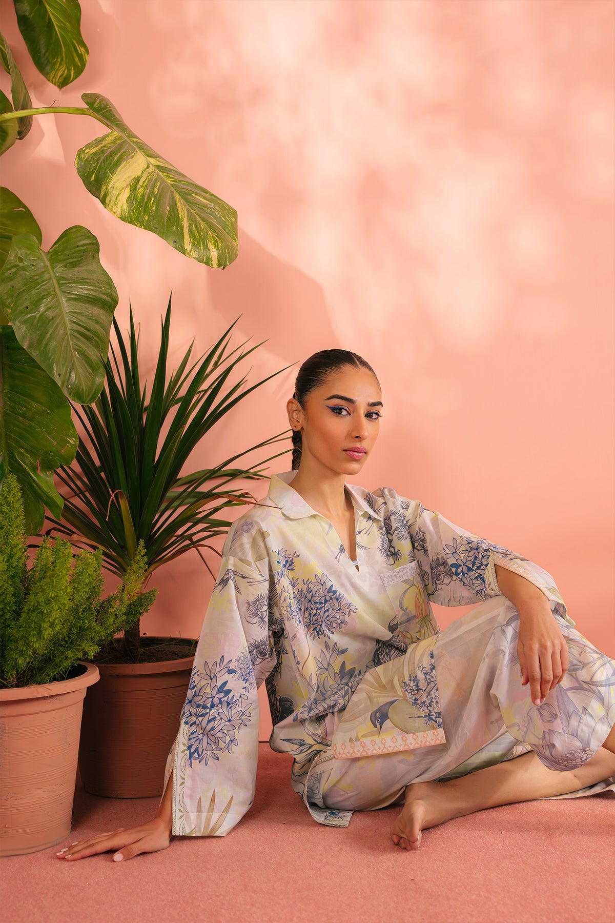 This printed co-ord set features delicate painterly illustrations of peacocks and botanicals in shades of lavender and sky blue. The relaxed silhouette with a collared neckline and flowing straight pants exudes quiet sophistication. Soft, fluid, and effortlessly elegant—this ensemble captures the art of understated luxe.